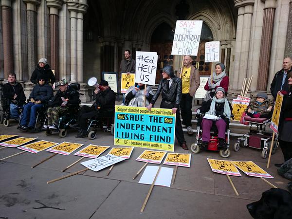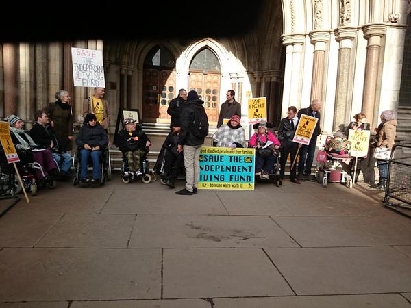 Many people are very angry. This photo shows ILF recipients and disabled campaigners blocking the entrance to the Royal Courts this morning in protest at the closure decision: